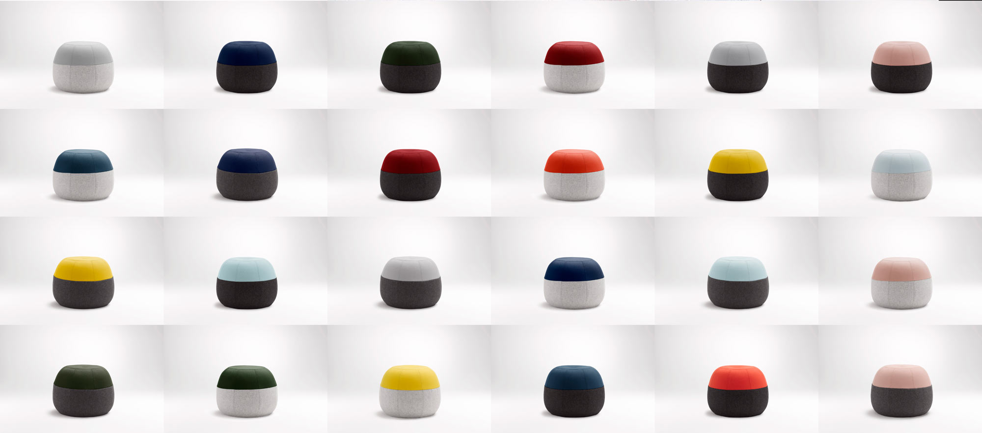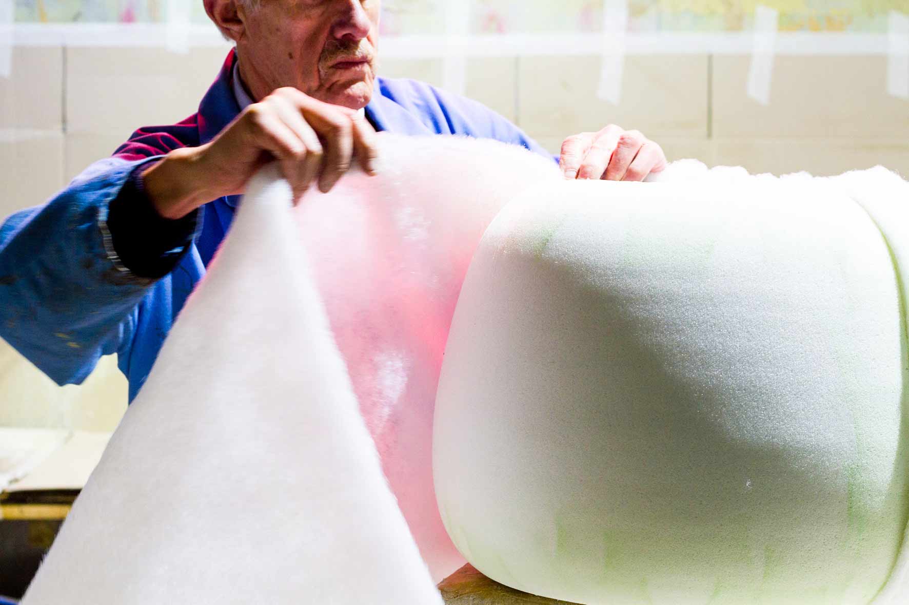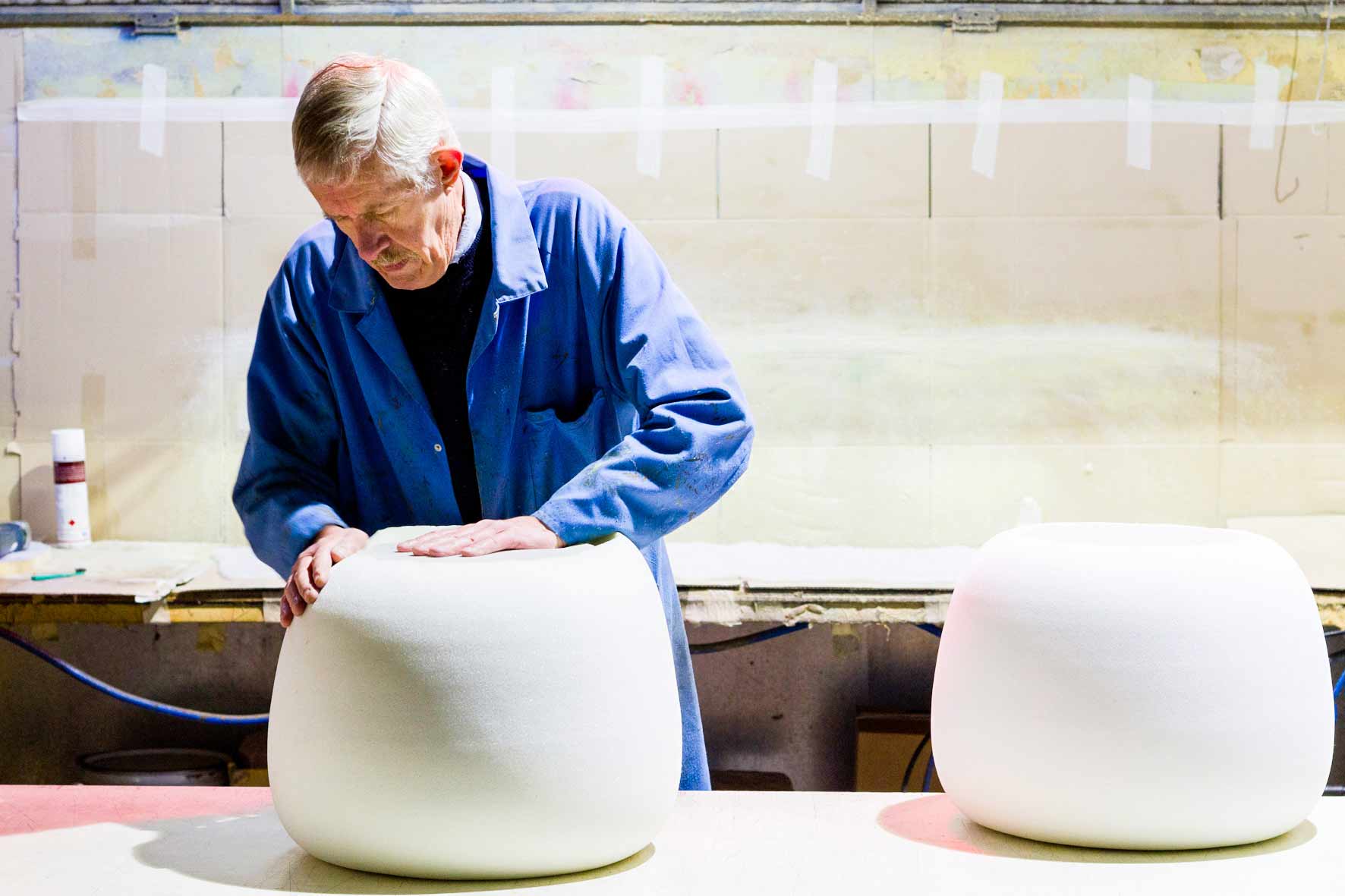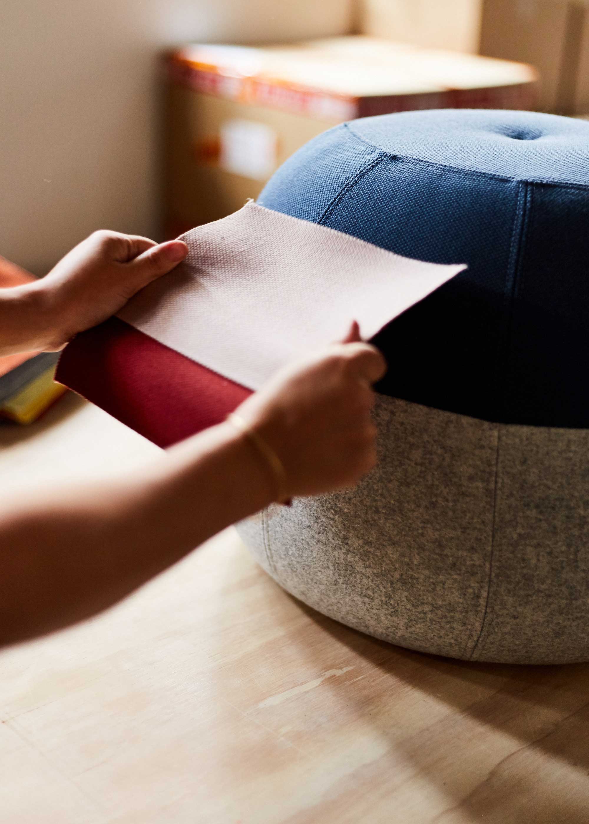 ケイトとハスレットは、腕利きの職人のアドバイスのもと、内部構造とデザインを維持しながらも、安定且つ座り心地の良さにも妥協しなかった。完成までに約6ヶ月程度という、ケイトからすると比較的短い打ち合わせだったそうだが、1つの工場で全行程が行えることが幸いしたと振り返る。 実のところ、ぷくはケイトが初めて商品化したクッション家具だった。そのため、職人との打ち合わせは勉強になった、と彼女は言う。座り心地を重視しつつ、コロンとした形を両立させた上、簡単に転がらないよう自立させるため、内部構造は何度も見直しを行ったそうだ。 「ぷくの製品化を通して、当初のコンセプトを変えることなく、余計なものを削ぎ落していくプロセスを学んだのよ」と彼女は言う。初めは、縫い目ももっと凝ったものだったが、「どんな空間や趣向にも溶け込むようなシンプルなデザイン」が何よりも一番大切だということになった。