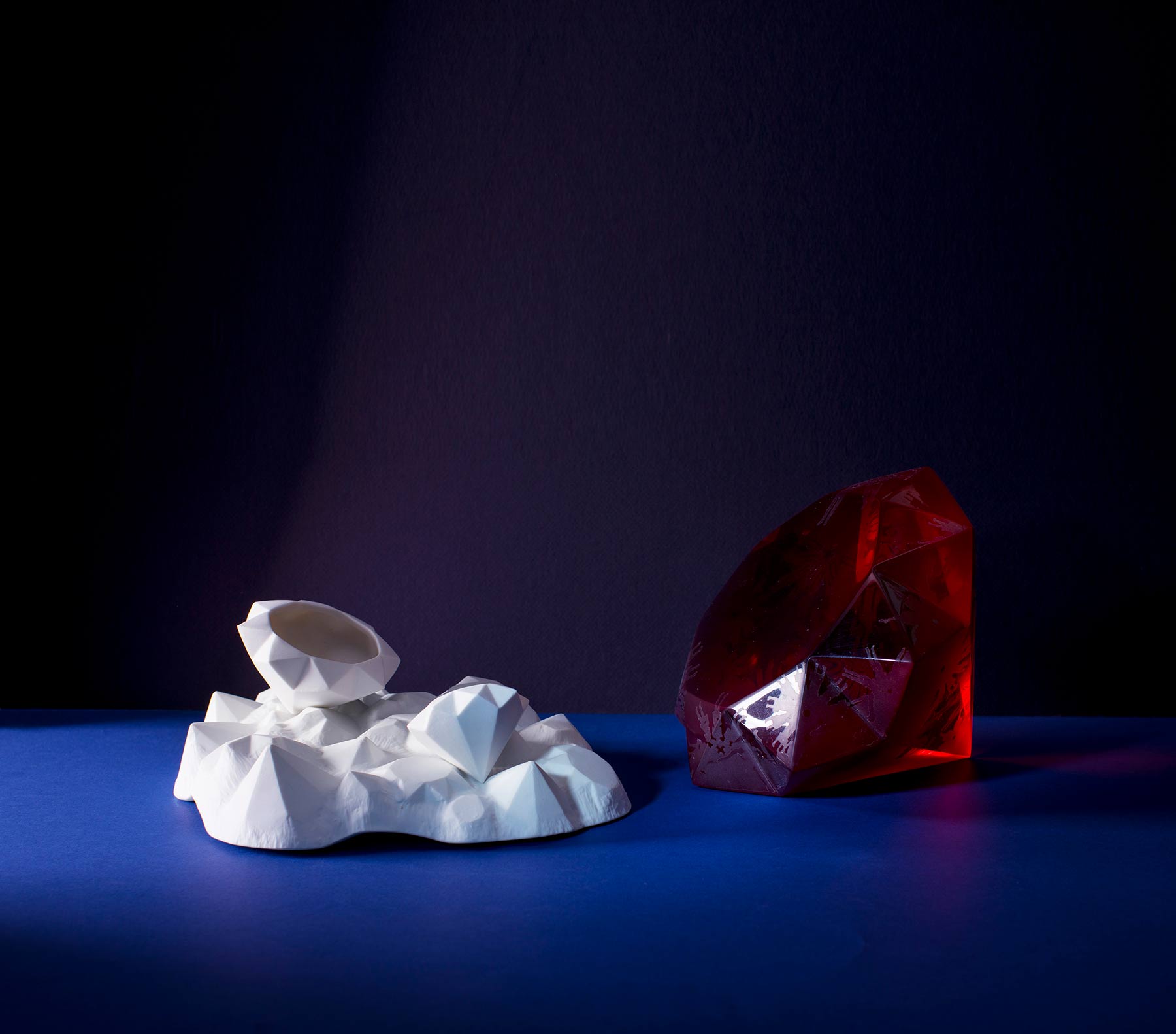 ダイヤモンドラボシリーズは、ダイニングテーブルの上でも、はたまたディスプレイとしても注目を浴びる製品だろう。ライアン氏の細やかなクラフトマンシップで作られた複雑な形状がその証拠だ。ファインポーセリンは無釉であるにもかかわらずシミに強い。1400℃で数時間焼成すると表面から液体が浸透しなくなり、シミに対してもガラスのような耐久性となるのだ。